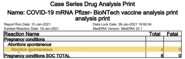 Λόγω αυτής της συμβουλής που κυκλοφόρησε η κυβέρνηση του Ηνωμένου Βασιλείου, είμαστε τόσο σοκαρισμένοι που βλέπουμε στην πρώτη δημοσιευμένη έκθεση για ανεπιθύμητες ενέργειες στα εμβόλια Covid, χρησιμοποιώντας δεδομένα που εισήχθησαν στο MHRA Yellow Card Scheme έως τις 24 Ιανουαρίου 2021 να είναι συνολικά 4 οι γυναίκες που είχαν υποστεί αποβολή ως αποτέλεσμα του εμβολίου Pfizer / BioNTech.